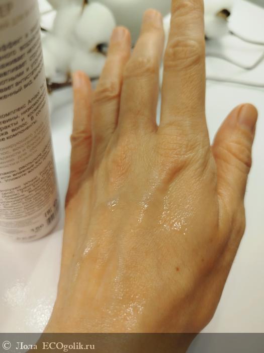 Текстура спрея жидкая и очень насыщенная, не липкая, не тягучая, после нанесения просто подсыхает, как водичка, не оставляя после себя следов тяжести, липкости или склеенности.