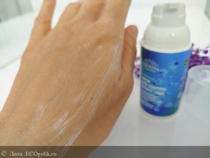 Крем слегка белеет после распределения, и немного даёт возможность поделать лёгкий массаж по контуру вокруг глаз, по массажным линиям, а далее впитывается.