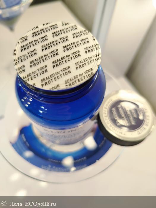 Баночка из плотного пластика, затемнённого синего цвета, не пропускающего Солнечные лучи, оберегая продукт. Сверху завинчивающаяся крышечка.