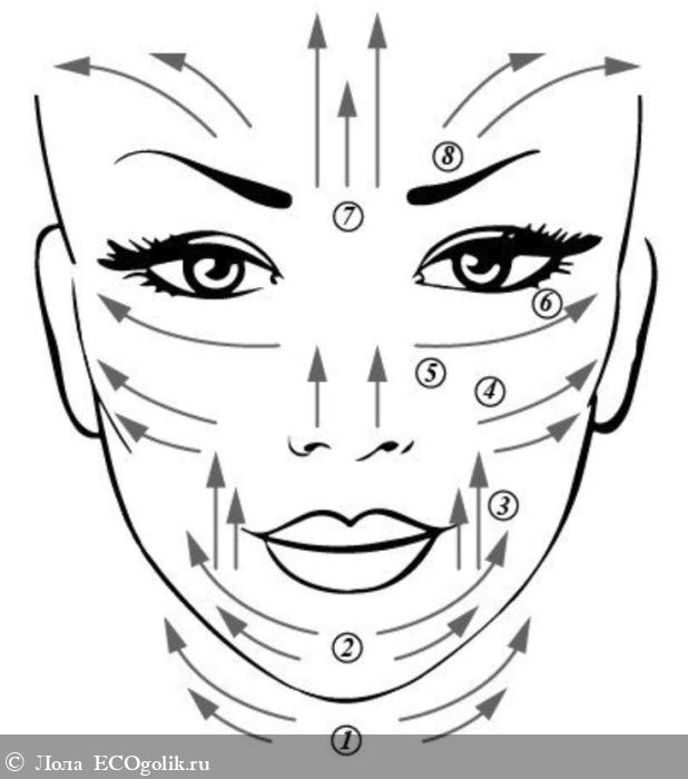 Нанести крем на очищенную кожу лица. Распределить по массажным линиям.