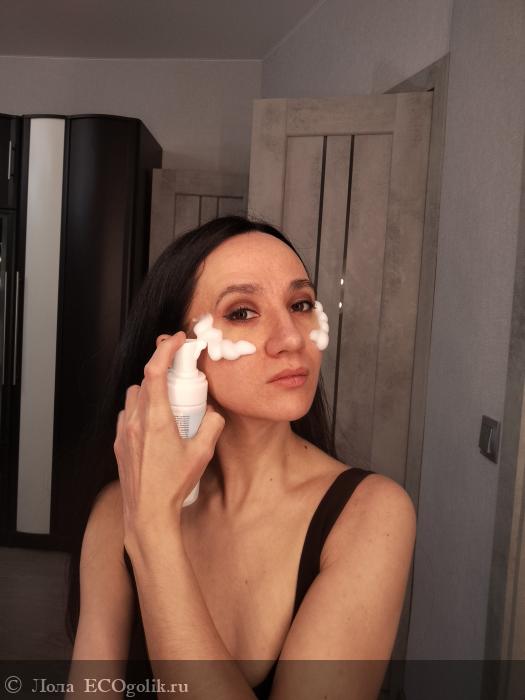 Наношу пенку по зонам на лице, очищаю, смываю, если косметики много, могу контрольным умыванием умыться ещё разок, чисто символически нанеся пенку и ещё раз умыть лицо, и таким образом и декоративка смыта, и очищение без травматизации кожи, без сухости и стянутости.