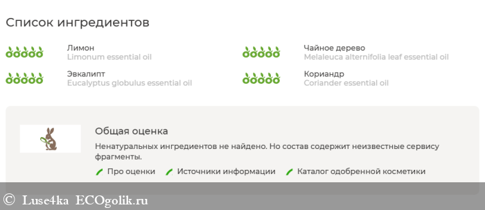Limonum essential oil (эфирное масло лимона), Melaleuca alternifolia (tea tree) leaf essential oil (эфирное масло чайного дерева), Оregano essential oil (эфирное масло майорана), Eucalyptus globulus essential oil (эфирное масло эвкалипта), Coriander essential oil (эфирное масло кориандра).