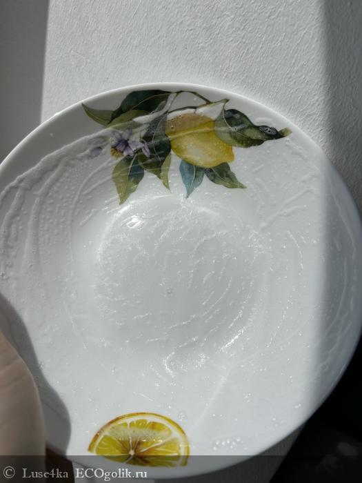 Не оставляя на посуде ни разводов,ни белого налёта,только блеск и скрип от чистоты!