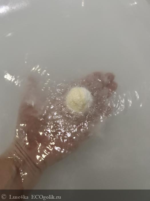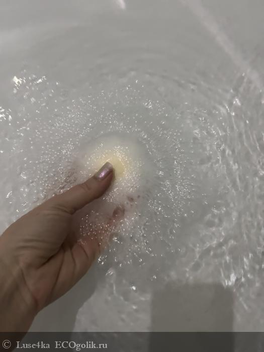 Данная бомбочка рассчитана на одно применение,поэтому смело опускаю бомбочку в тёплую и воду и любуюсь процессом исчезновения