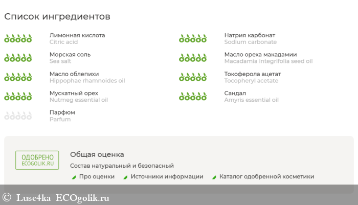 Citric acid (лимонная кислота), Sodium carbonate (карбонат натрия), Sea salt (соль морская), Macadamia integrifolia seed oil (масло макадамии), Hippophae rhamnoides oil (масло облепиховое), Tocopheryl acetate (витамин Е), Nutmeg essential oil (эфирное масло мускатного ореха), Amyris essential oil (эфирное масло сандала), Parfum (отдушка).