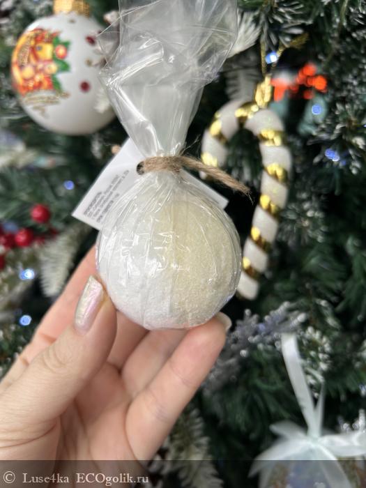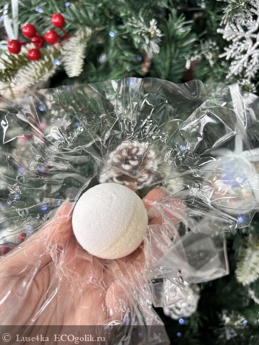 Цвет бомбочки соответствует активным ингредиентам-бело-жёлтое сочетание кокоса и ореха,аромат также соответствует названию- кокосу с нотками мускатного ореха