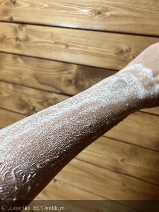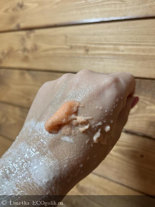 Частички скраба среднего размера и мою хорошо подготовленную,распаренную кожу они не травмируют вообще,а нежно убирают все омертвевшие клетки,делая мою кожу нежной и бархатистой на ощупь