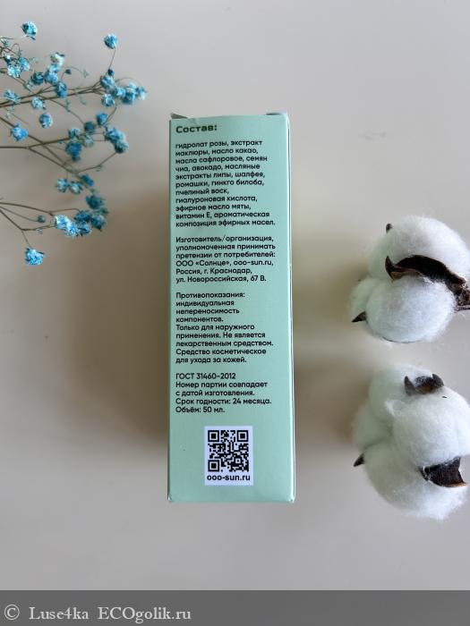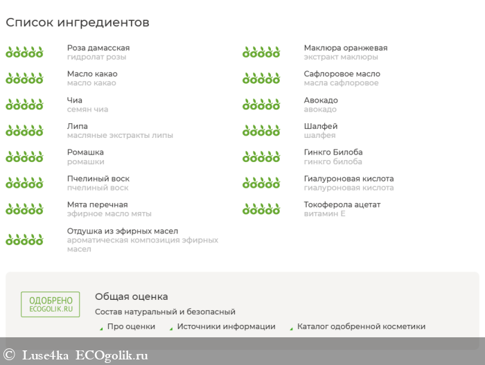 Состав: гидролат розы, экстракт маклюры, масло какао, масла сафлоровое, семян чиа, авокадо, масляные экстракты липы, шалфея, ромашки, гинкго билоба, пчелиный воск, гиалуроновая кислота, эфирное масло мяты, витамин Е, ароматическая композиция эфирных масел.