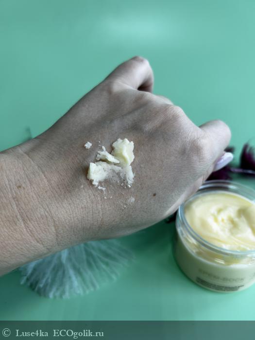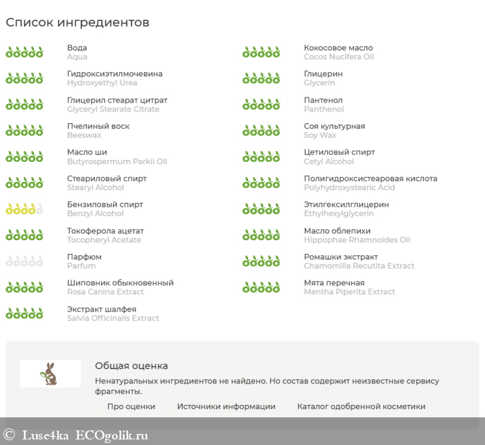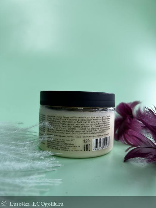 Состав :Aqua, Cocos Nucifera (кокоса) Oil, Hydroxyethyl Urea, Glycerin, Glyceryl Stearate Citrate, Panthenol, Beeswax (воск пчелиный), Soy (Soybean) Wax (соевый воск), Butyrospermum Parkii (ши) Oil, Cetyl Alcohol, Stearyl Alcohol, Polyhydroxystearic Acid (полигидроксистеаровая кислота), Benzyl Alcohol (and) Ethylhexylglycerin, Tocopheryl Acetate (витамин Е), Hippophae Rhamnoides (облепихи) Oil, Parfum, Monarda Fistulosa Oil (эфирное масло монарды дудчатой), Chamomilla Recutita (ромашки) Extract, Rosa Canina (шиповника) Extract, Mentha Piperita (мяты) Extract, Salvia Officinalis (шалфея) Extract.