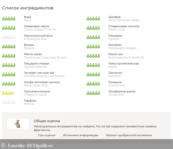 Aqua, Salvia Officinalis Water, Olea Europaea (olive) Fruit Oil, Stearic Acid, Emulsifying Wax, Glycerin, Betaine, Hydrolyzed Collagen, Theobroma Cacao Seed Butter, Butyrospermum Parkii (Shea) Oil, Glyceryl Stearate, Kaolin, Camellia Sinensis Leaf Extract, Aloe Arberescens Leaf Extract, Pantenol, Alpha Lipoic Acid (ALA), Chamomilla, Propylene Glycol, Tocopherol, Parfum.