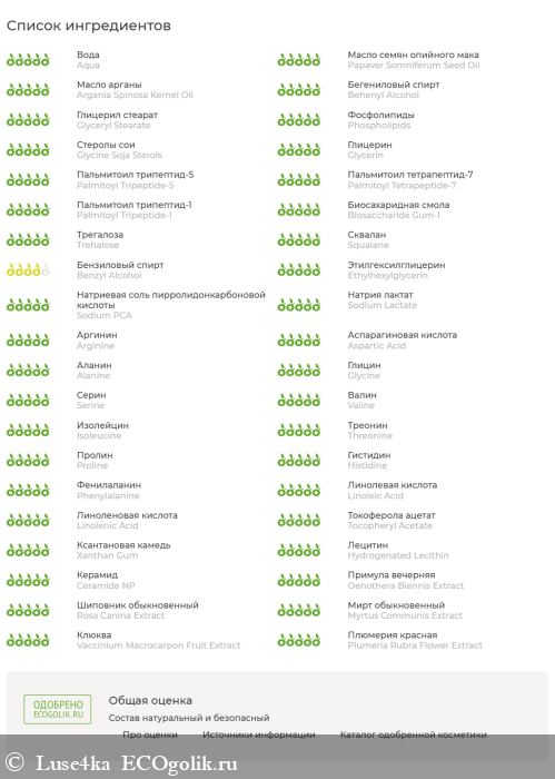 Aqua, Papaver Somniferum Seed (мака семян) Oil, Argania Spinosa Kernel (арганы) Oil, Behenyl Alcohol (and) Glyceryl Stearate (and) Phospholipids (and) Glycine Soja Sterols, Glycerin (and) Palmitoyl Tripeptide-5 (and) Palmitoyl Tetrapeptide-7 (and) Palmitoyl Tripeptide-1, Biosaccharide Gum-1, Trehalose, Squalane, Benzyl Alcohol (and) Ethylhexylglycerin, Sodium PCA (and) Sodium Lactate (and) Arginine (and) Aspartic Acid (and) Alanine (and) Glycine (and) Serine (and) Valine (and) Isoleucine (and) Threonine (and) Proline (and) Histidine (and) Phenylalanine, Linoleic Acid (and) Linolenic Acid, Tocopheryl Acetate, Xanthan Gum, Hydrogenated Lecithin, Ceramide NP, Oenothera Biennis (примулы вечерней) Extract, Rosa Canina (шиповника) Extract, Myrtus Communis (мирта) Extract, Vaccinium Macrocarpon Fruit (клюквы) Extract, Plumeria Rubra (Frangipani) Flower (франжипани) Extract.