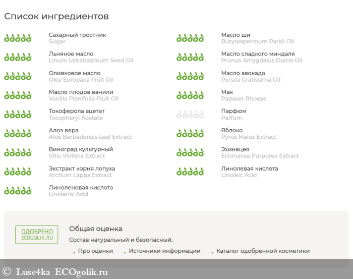 Sugar (сахар), Butyrospermum Parkii (ши) Oil (and) Linum Usitatissimum Seed (льна) Oil (and) Prunus Amygdalus Dulcis (миндаля) Oil (and) Olea Europaea Fruit (оливы) Oil (and) Persea Gratissima (авокадо) Oil, Vanilla Planifolia Fruit (ванили) Oil, Papaver Rhoeas (мак семена), Tocopheryl Acetate (витамин Е), Parfum, Aloe Barbadensis Leaf (алоэ вера) Extract, Pyrus Malus (яблока) Extract, Vitis Vinifera (косточки винограда) Extract, Echinacea Purpurea (эхинацеи) Extract, Arctium Lappa (корня лопуха) Extract, Linoleic Acid (and) Linolenic Acid (витамин F)