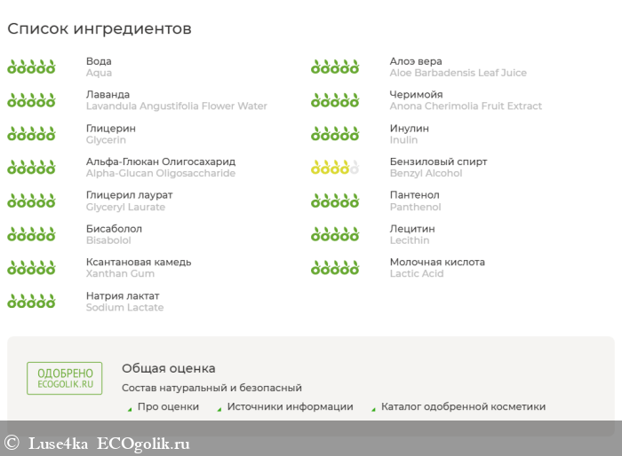 Aqua (вода родниковая), Aloe Barbadensis Leaf Juice (гель алоэ вера), Lavandula Angustifolia Flower Water (гидролат лаванды), Anona Cherimolia Fruit Extract (смесь фруктовых энзимов, экстрагированных из мякоти плодов черимойи), Glycerin (растительный глицерин), Inulin (and) Alpha-Glucan Oligosaccharide (инулин, альфа-глюкан олигосахарид), Benzyl Alcohol (and) Glyceryl Laurate (бензиловый спирт, глицерил лаурат), Panthenol (Д-пантенол), Bisabolol (бисаболол), Lecithin (лецитин), Xanthan Gum (ксантановая камедь), Lactic Acid (молочная кислота), Sodium Lactate (лактат натрия).