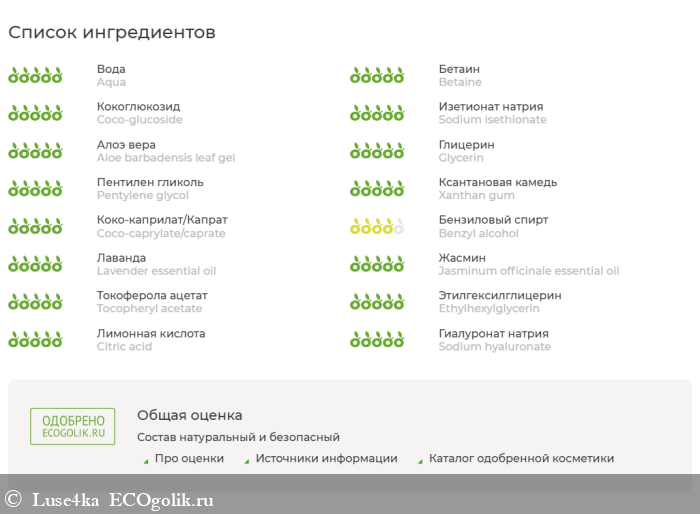 Aqua (вода дистиллированная), Betaine (бетаин), Coco-glucoside (кокоглюкозид), Sodium isethionate (изетионат натрия), Aloe barbadensis (aloe vera) leaf gel (гель алоэ вера), Glycerin (глицерин), Pentylene glycol* (пентилен гликоль), Xanthan gum (ксантановая камедь), Coco-caprylate/caprate (коко-каприлат/капрат), Benzyl alcohol (бензиловый спирт), Lavender essential oil (эфирное масло лаванды), Jasminum officinale essential oil (эфирное масло жасмина), Tocopheryl аcetate (витамин Е), Ethylhexylglycerin (этилгексилглицерин), Citric acid (лимонная кислота), Sodium hyaluronate (гиалуронат натрия). *изготовлен из багассы, получаемого из сахарного тростника.