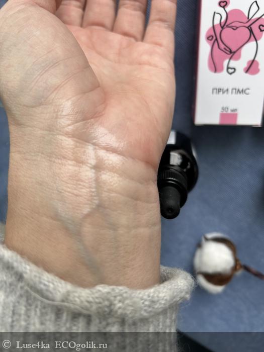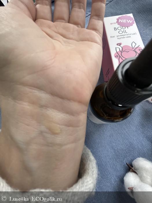 Для полного впитывания масла нужно время и главным плюсом является тот факт,что масло не оставляет жирных пятен на одежде,т.е.даже на работе можно нанести на активные точки(за ушами,на запястья,на ладони)и облегчить своё состояния во время всего цикла