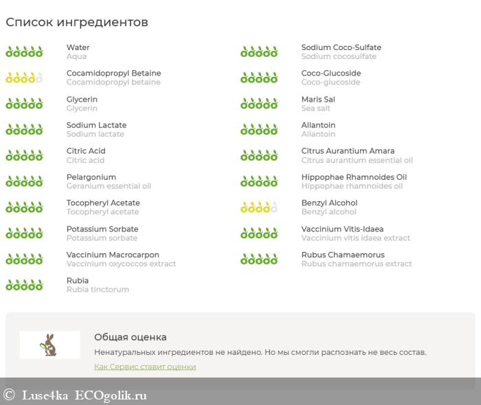Aqua (вода дистиллированная), Sodium cocosulfate* (кокосульфат натрия), Cocamidopropyl betaine (кокaмидопропилбетаин), Coco-glucoside (кокоглюкозид), Glycerin (глицерин), Sea salt (соль морская), Sodium lactate (лактат натрия), Allantoin (аллантоин), Citric acid (лимонная кислота), Citrus aurantium essential oil (эфирное масло апельсина), Geranium essential oil (эфирное масло герани), Hippophae rhamnoides oil (масло облепиховое), Tocopheryl аcetate (витамин Е), Benzyl alcohol (бензиловый спирт), Potassium sorbate (сорбат калия), Vaccinium vitis idaea extract (экстракт брусники), Vaccinium oxycoccos extract (экстракт клюквы), Rubus chamaemorus extract (экстракт морошки), Fragаria ananаssa extract (экстракт сухой клубники), Rubia tinctorum (корень марены красильной). *является мягким ПАВ, получаемым из кокосового масла
