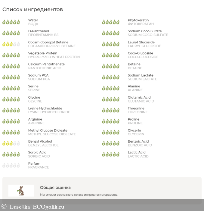 ВОДА, НАТРИЯ КОКОСУЛЬФАТ, КОКАМИДОПРОПИЛБЕТАИН, ЛАУРИЛ ГЛЮКОЗИД, ФИТОКЕРАТИН, КОКО-ГЛЮКОЗИД, ПРОВИТАМИН В5 (Д-ПАНТЕНОЛ), БЕТАИН, НАТРИЕВАЯ СОЛЬ ПИРРОЛИДОНКАРБОНОВОЙ КИСЛОТЫ, ЛАКТАТ НАТРИЯ, СЕРИН, АЛАНИН, ГЛИЦИН, ГЛУТАМИНОВАЯ КИСЛОТА, ЛИЗИНА ГИДРОХЛОРИД, ТРЕОНИН, АРГИНИН, ПРОЛИН, МЕТИЛ ГЛЮКОЗЫ ДИОЛЕАТ, ГЛИЦЕРИН, БЕНЗИЛОВЫЙ СПИРТ, БЕНЗОЙНАЯ КИСЛОТА, СОРБИНОВАЯ КИСЛОТА, МОЛОЧНАЯ КИСЛОТА, АРОМАТИЧЕСКАЯ КОМПОЗИЦИЯ