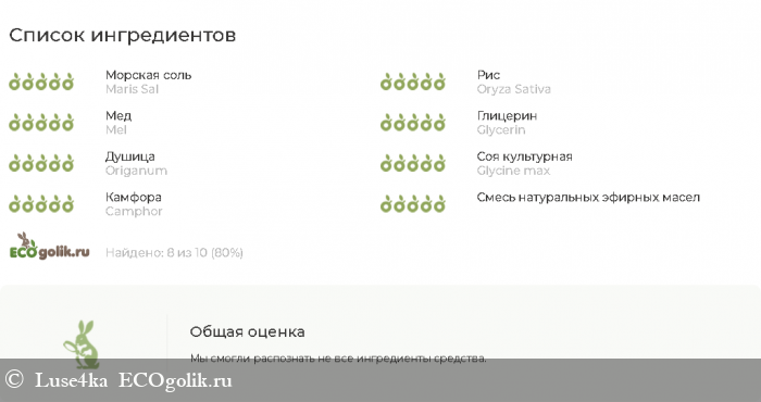 соль морская, рисовая мука, мед натуральный, глицерин, масла (ши, какао, льна, рыжика, горчичное, грецкого ореха, зверобоя), душица и эвкалипт молотые, воск сои, камфора, эфирные масла (бергамота, лимона, пихты, эвкалипта).