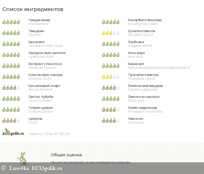 черничная вода, ниацинамид, аскорбил глюкозид (витамин С), глицерин, бутиленгликоль, экстракт брусники, экстракт ежевики сизой, экстракт земляники лесной, экстракт клюквы болотной, экстракт малины обыкновенной, гиалуроновая кислота, сок алоэ вера, экстракт планктона, акваксил, ксантановая камедь, пропиленгликоль, бензиловый спирт, этилгексилглицерин, эфирное масло литсеи кубеба, лимонная кислота, цитрат натрия, гидроксид калия, цитраль, лимонен