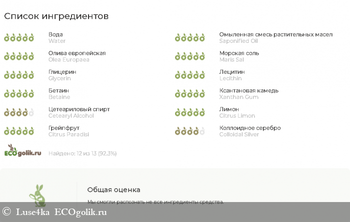 вода, калиевые соли масел кокоса и оливы, масла (ши, кокоса, льна, касторовое, кунжута), морская соль, глицерин, лецитин, бетаин, ксантановая камедь, цетеариловый спирт, эфирные масла лимона и грейпфрута, концентрат коллоидного серебра