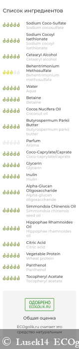 Волосы после данного шампуня-кондиционера мягкие, чистые, расчёсываются легко, с красивым блеском. Пробовала также использовать только шампунь, волосы после него мягкие, не сухие как мочалка по длине (у меня они склонные к этому) .