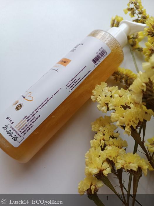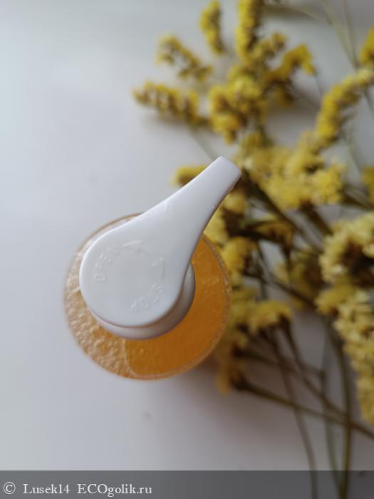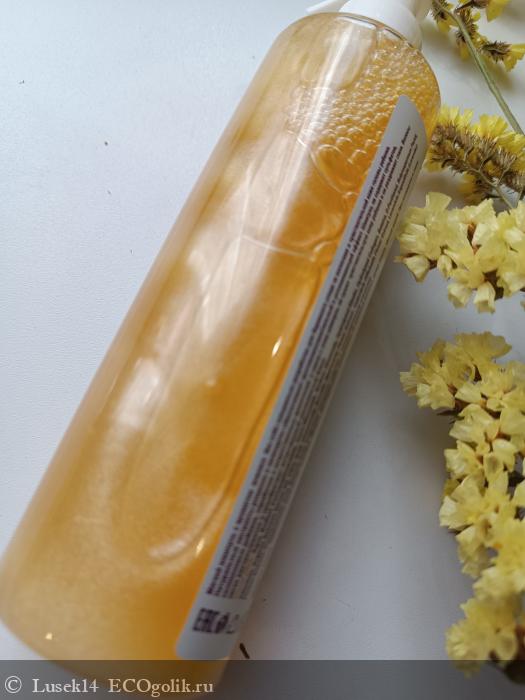 Так выглядит сам шампунь - светло оранжевого цвета, с лëгким золотистым шиммером. Очень красиво смотрится, и детям нравится
