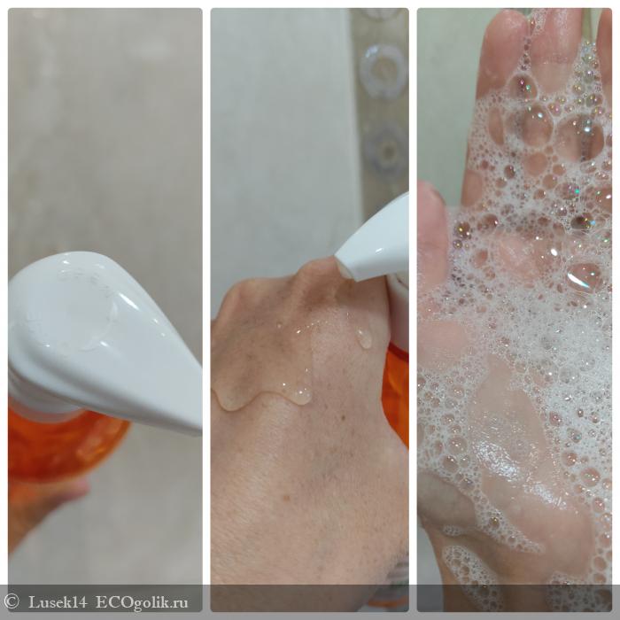 Сам гель прозрачный, очень хорошо пенится. Пена белая, воздушная, отлично очищает кожу.
