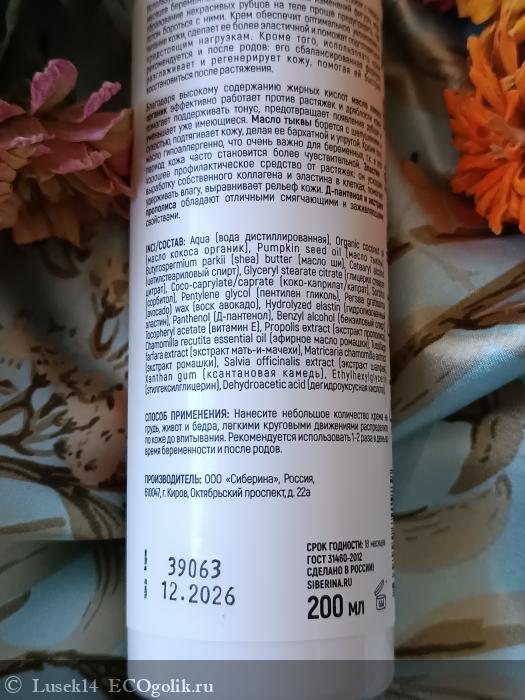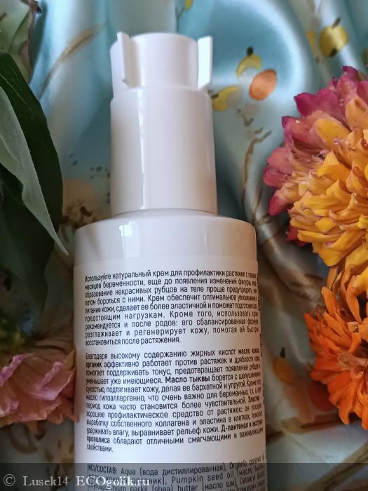 "Используйте натуральный крем для профилактики растяжек с первых месяцев беременности, еще до появления изменений фигуры, ведь образование некрасивых рубцов на теле проще предупредить, чем потом бороться с ними. Крем обеспечит оптимальное увлажнение и питание кожи, сделает ее более эластичной и поможет подготовиться к предстоящим нагрузкам. Кроме того, использовать крем рекомендуется и после родов: его сбалансированная формула разглаживает и регенерирует кожу, помогая ей быстрее восстановиться после растяжения. Благодаря высокому содержанию жирных кислот масло кокоса органик эффективно работает против растяжек и дряблости кожи: помогает поддерживать тонус, предотвращает появление рубцов и уменьшает уже имеющиеся. Масло тыквы борется с шелушением и сухостью, подтягивает кожу, делая ее бархатной и упругой. Кроме того, масло гипоаллергенно, что очень важно для беременных, т.к. в этот период кожа часто становится более чувствительной. Эластин - хорошее профилактическое средство от растяжек: он ускоряет выработку собственного коллагена и эластина в клетках, помогает удерживать влагу, выравнивает рельеф кожи. Д-пантенол и экстракт прополиса обладают отличными смягчающими и заживляющими свойствами."