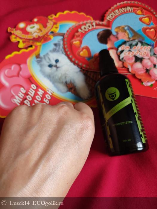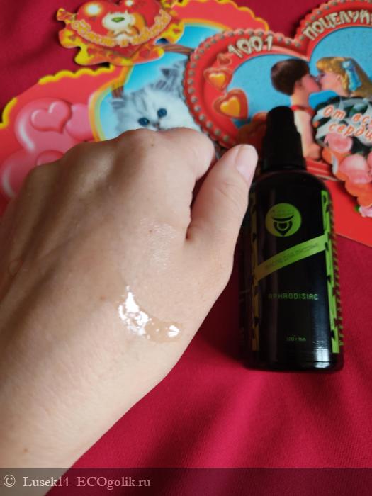 Масло Афродизиак светло-желтого цвета. Оно не жирное. При его распределении кожа становится гладкой, бархатистой и ладоням приятно и легко скользить по телу. Маслянистая пленка не ощущается. Расход небольшой, много лить не нужно