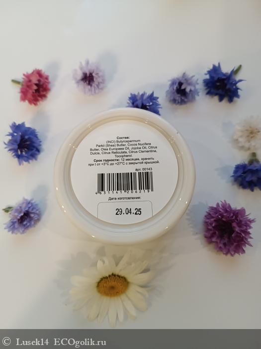 Крем- масло имеет мягкую, податливую консистенцию. Белого цвета, аромат раскрывается в процессе использования, приятный, цитрусовый, ярче всего я слышу апельсиновый (также в составе есть эфирные масла мандарина и клементина, которые тоже даëт аромат).