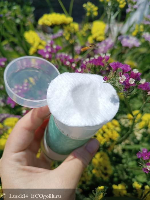На дозатор сверху кладу ватный диск и делаю пару нажимов. Диск пропитывается мицеллярной водой. На ватном диске какой то цвет у воды не заметен, прозрачная. Запах у неë лëгкий (скорее всего входящих компонентов, отдушек не чувствуется).