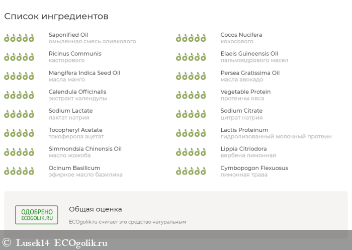 "Натуральное мыло, обогащенное маслом авокадо и протеинами овса, нежно очищает кожу, придает чувство комфорта. Комплекс протеинов овса и молочного протеина защищает кожу от обезвоживания, предотвращая появление сухости. Масло жожоба удерживает влагу, сохраняет эластичность кожи. Молочный протеин и протеины овса смягчают кожу, экстракт календулы уменьшает раздражение. Аромат вербены снимает накопившуюся усталость, поднимает настроение."