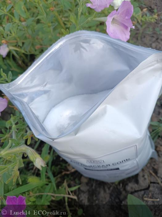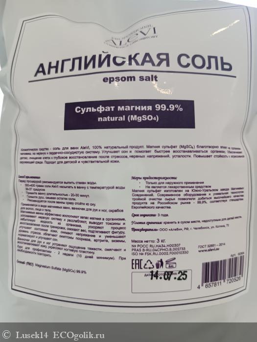 Магниевая соль AleVi (сульфат магния для принятия ванн). Масса её целых 3 кг. Находится в прочном пакете с ЗИП застëжкой и отрывной частью.