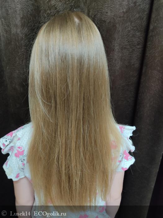 Шампунь пенится отлично. На фото волосы средней дочки, они чуть ниже лопаток и тонкие. Хватает одного намыливания. Также мою этим шампунем волосы младшей и старшей дочкам. Всем шампунь отлично промывает волосы, они становятся чистыми, мягкими, с лёгким ароматом отдушки. Также пена отлично смывается водой.