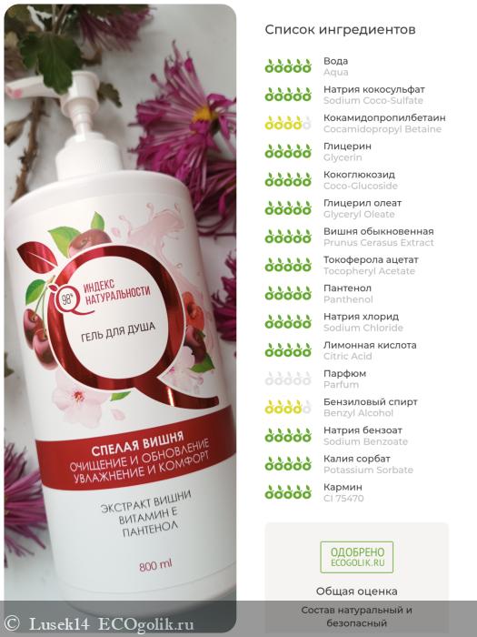 На флаконе видим описание средства и ключевых отдельных ингредиентов. Гель для душа сделан на основе дерматологически мягких ПАВ, в составе есть даже экстракт вишни, витамин Е, пантенол.