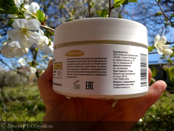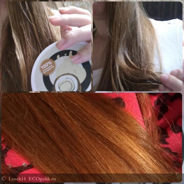 В качестве маски для волос баттер тоже вполне хорошо себя ведёт - наношу небольшое количество по длине волос, оставляю его минут на 40, далее смываю как обычно шампунем в 2 намыливания и использую немного бальзама. Волосы после данной маски становятся более мягкими, напитанными, блестящими.