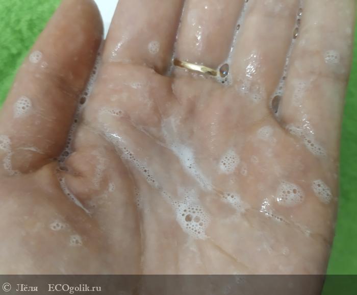 Средство имеет умеренную жидкую консистенцию. При намыливании получается хорошая, густая пена. Несмотря на то, что мыло натуральное, оно чудесно пенится.