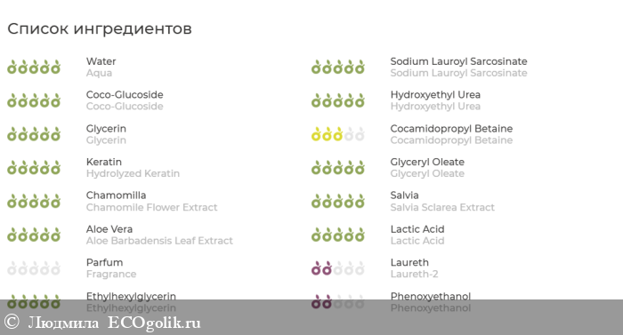 Главный ингредиент шампуня — кератин, который укрепляет структуру волоса, делает его более гладким и упругим. Кератин заполняет повреждённые участки, восстанавливая волосы от корней до самых кончиков. Этот шампунь также содержит увлажняющие компоненты, которые не только питают, но и защищают волосы от пересушивания, создавая эффект салонного ухода.Хотя экоголик не определяет состав как идеальный.