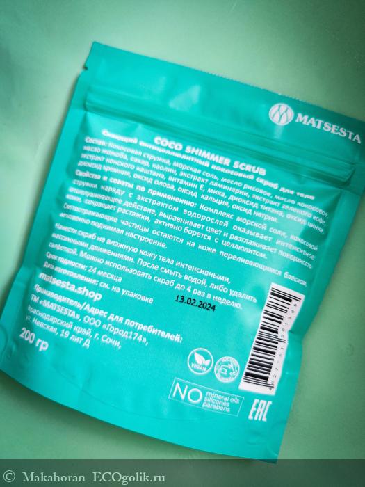 Сейчас я использую натуральный кокосовый скраб от бренда MATSESTA с мерцающим эффектом.