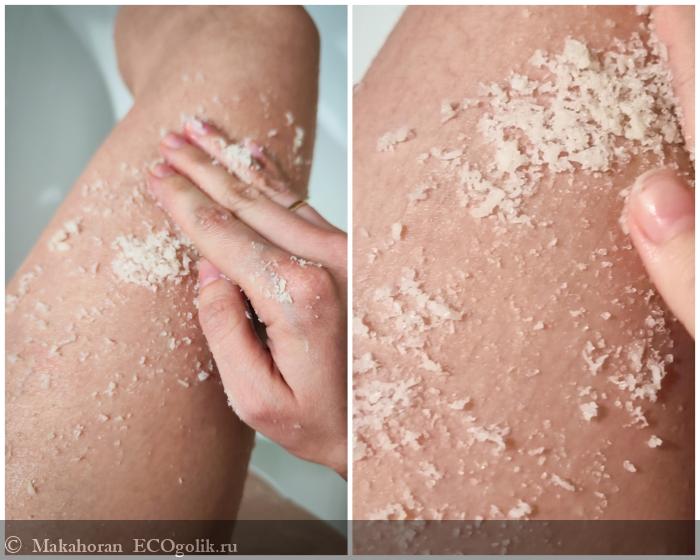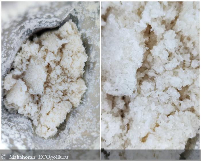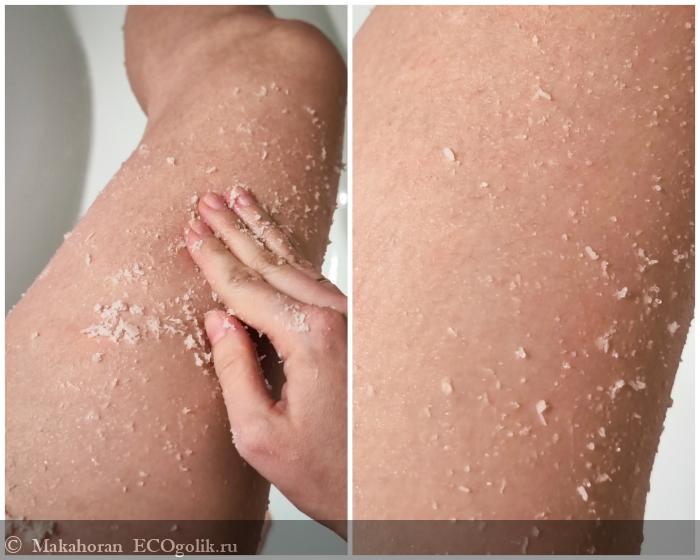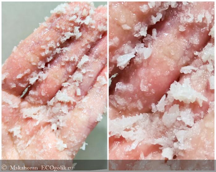 По ощущениям скраб приятный, не грубый. Соль имеет средний помол, поэтому её воздействие на коже ощущается хорошо, но без какого-либо дискомфорта.