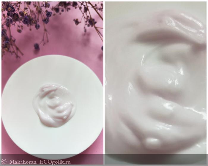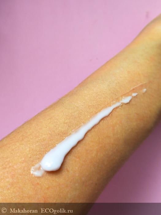 Консистенция тоже получилась у производителя удачной, поскольку средство кремообразное, в меру густое. Поэтому оно хорошо держит форму и не растекается, но при этом очень легко распределяется по коже