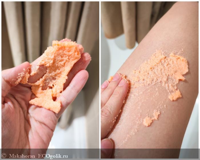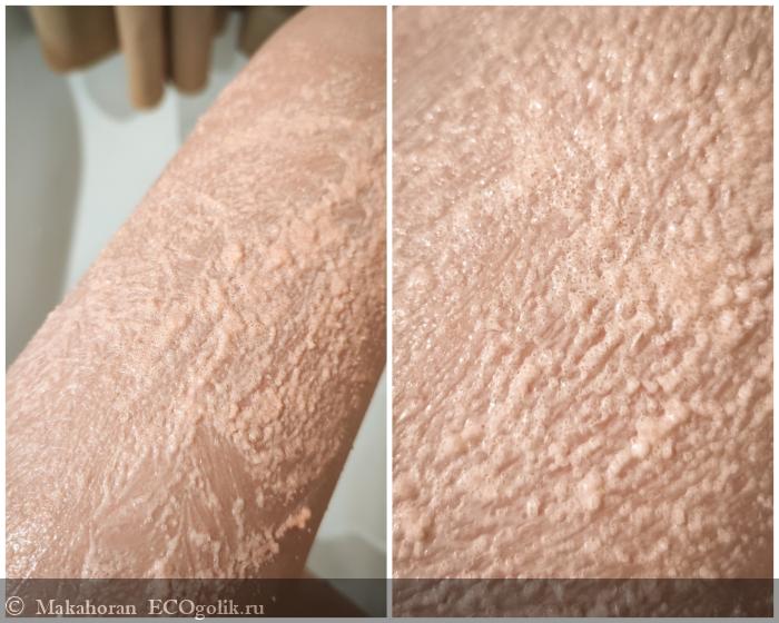 Я использую скраб примерно 2 раза в неделю, наношу на влажную кожу в небольшом количестве. Данный скраб по консиситенции не такой густой, но все также не растекается и не осыпается во время использования.