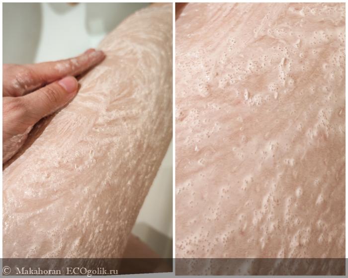 Смывается скраб просто струей воды, не нужно никаких дополнительных движений. После чего кожа становится гладкой, нежной и чистой.