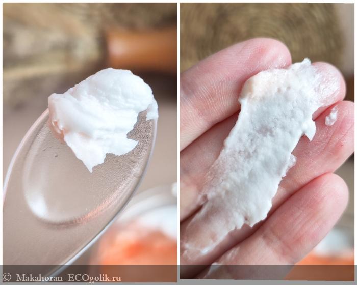 Скраб этот необычный, поскольку является двухфазным, т.е. состоит из двух текстур: скраб с тростниковым сахаром и кремовая часть белого цвета.