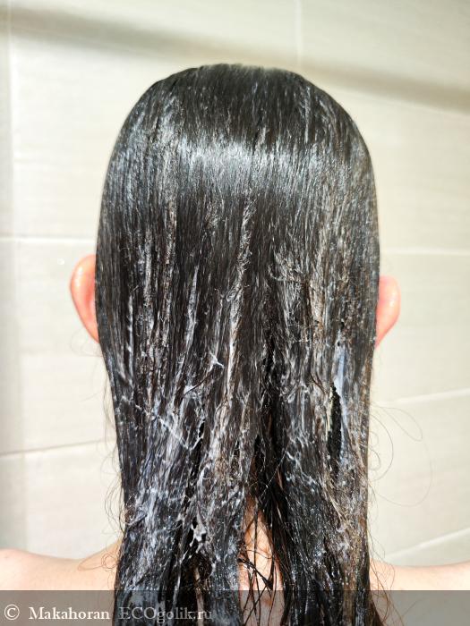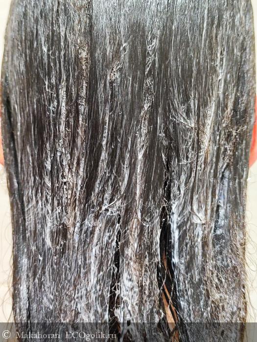 Расход у средства небольшой, на длинные волосы уходит примерно столовая ложка средства. Распределяется маска легко и приятно скользит по влажным волосам.