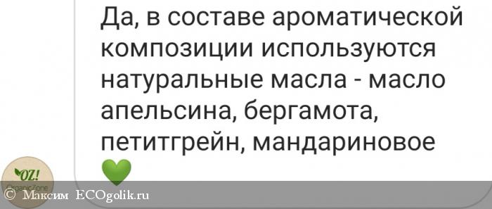 Летний, задорный, брызжущий соком цитрусов и свежестью молодой зеленой травы запах обеспечивается ароматической композицией. Вопрос происхождения возник не смотря на обещанную 100% натуральность продукта. Решено было обратиться к производителю с этим вопросом
