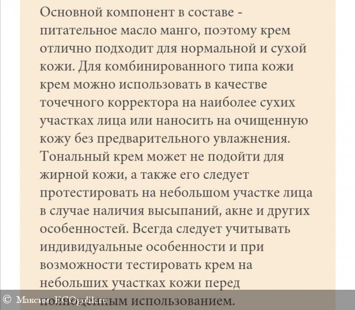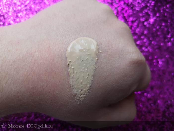 Это густая, маслянистая субстанция, которая никаким образом не хочет впитываться и лежит сверху, отражая едва ли не зеркальным блеском окружающую вас действительность. Фактически по консистенции это жидкий вазелин с пигментом, который ни хрена нн фиксируется, с которого все течёт +к этому создающий на лице светооржающую маску., смывается с кожи он только мылом, любое другое средство (кроме кислот) заразу эту вообще не берет и потом все полотенце грязное.🤦♂️