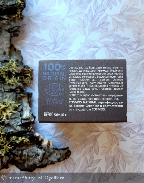 Состав: Sodium Coco-Sulfate (ПАВ из кокоса), Zea Mays Starch (Крахмал), Theobroma Cacao Seed Butter (Масло какао), Cocos nucifera oil (Масло кокосовое), Butyrospermum Parkii Butter (Масло ши), Sodium Chloride (Морская соль), Cetyl Alcohol (Цетиловый спирт), Inulin (Инулин), Macadamia Integrifolia/Tetraphylla Seed Oil (Масло макадамии), Charcoal powder (Сажа дуба), Mentha Arvensis Oil (Эфирное масло мяты).