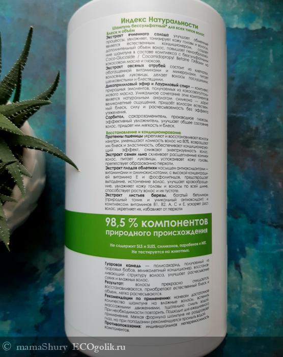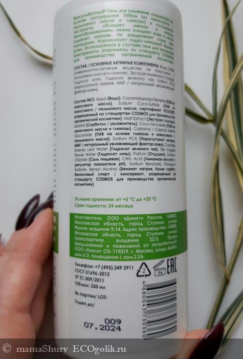 Состав INCI: Aqua (Вода), Cocamidopropyl Betaine (ПАВ из кокосового масла), Sodium Coco-Sulfate (ПАВ из кокосового / пальмового масла, сертификат ECOSERT, разрешенный по стандарту COSMOS для производства органической косметики), Malt Extract (Экстракт ячменного солода), Sorbitol (Сорбитол / увлажнитель), Coco-Glucoside (ПАВ из кокосового масла и глюкозы), Capryloyl/Caproyl Methyl Glucamide (ПАВ на основе глюкозы и кокосового масла), Sodium PCA (Пироглутамат натрия, NMF / натуральный увлажняющий фактор кожи), Camellia Sinensis Leaf Water (Гидролат зеленого чая), Tilia Vulgaris Flower Water (Гидролат липы), Parfum (Отдушка), Sodium Chloride (Соль пищевая), Citric Acid (Лимонная кислота / регулятор показателя pH), Sodium Benzoate, Potassium Sorbate, Benzyl Alcohol (Бензоат натрия, Калия сорбат, Бензиловый спирт / консервант, разрешенный по стандарту COSMOS для производства органической косметики).