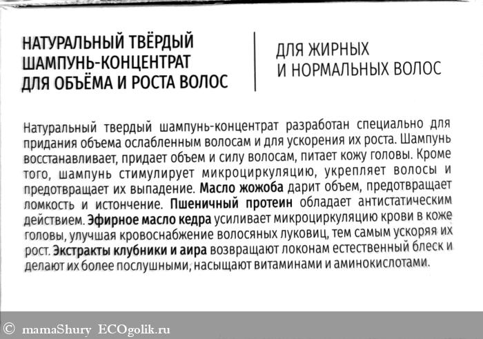 Состав: Sodium cocosulfate (кокосульфат натрия), Sodium сocoyl isethionate (кокоил изетионат натрия), Aqua (вода дистиллированная), Вetaine (бетаин), Inulin (инулин), Citric acid (лимонная кислота), Coco-caprylate/caprate (коко-каприлат/капрат), Panthenol (Д-пантенол), Simmondsia chinensis (jojoba) seed oil (масло жожоба), Citrus bergamia essential oil (эфирное масло бергамота), Wheat protein (пшеничный протеин), Cedarwood siberian essential oil (эфирное масло кедра), Tocopheryl аcetate (витамин Е), Spirulina maxima (спирулина), Equisetum arvense extract (экстракт хвоща), Achillea millefolium extract (экстракт тысячелистника), Fragаria ananаssa extract (экстракт клубники), Tussilago farfara extract (экстракт мать-и-мачехи), Urtica dioica extract (экстракт крапивы), Acorus calamus extract (экстракт аира), Aesculus hippocastanum extract (экстракт каштана).